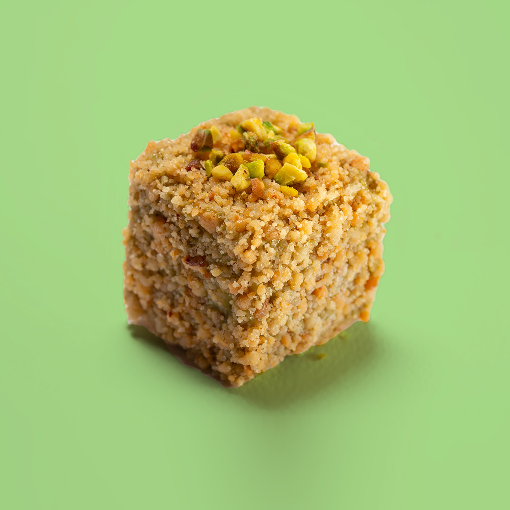 Croccante semifreddo al pistacchio ricoperto con crumble di pistacchio di Bronte e un goloso cuore di pistacchio.