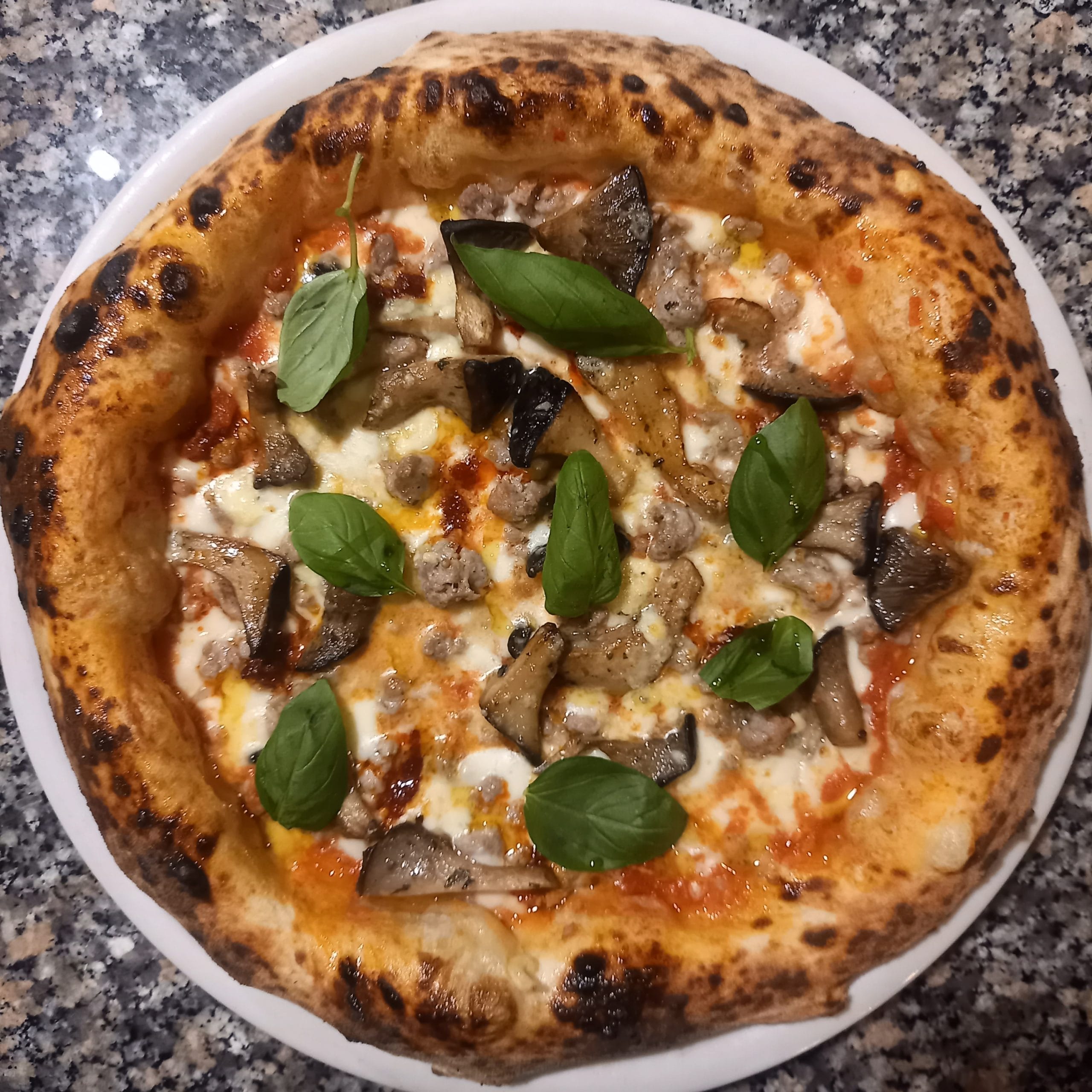 Pomodoro, Mozzarella, Salsiccia fresca di suino, Gorgonzola, Funghi Cardoncelli e Nduja Calabrese.